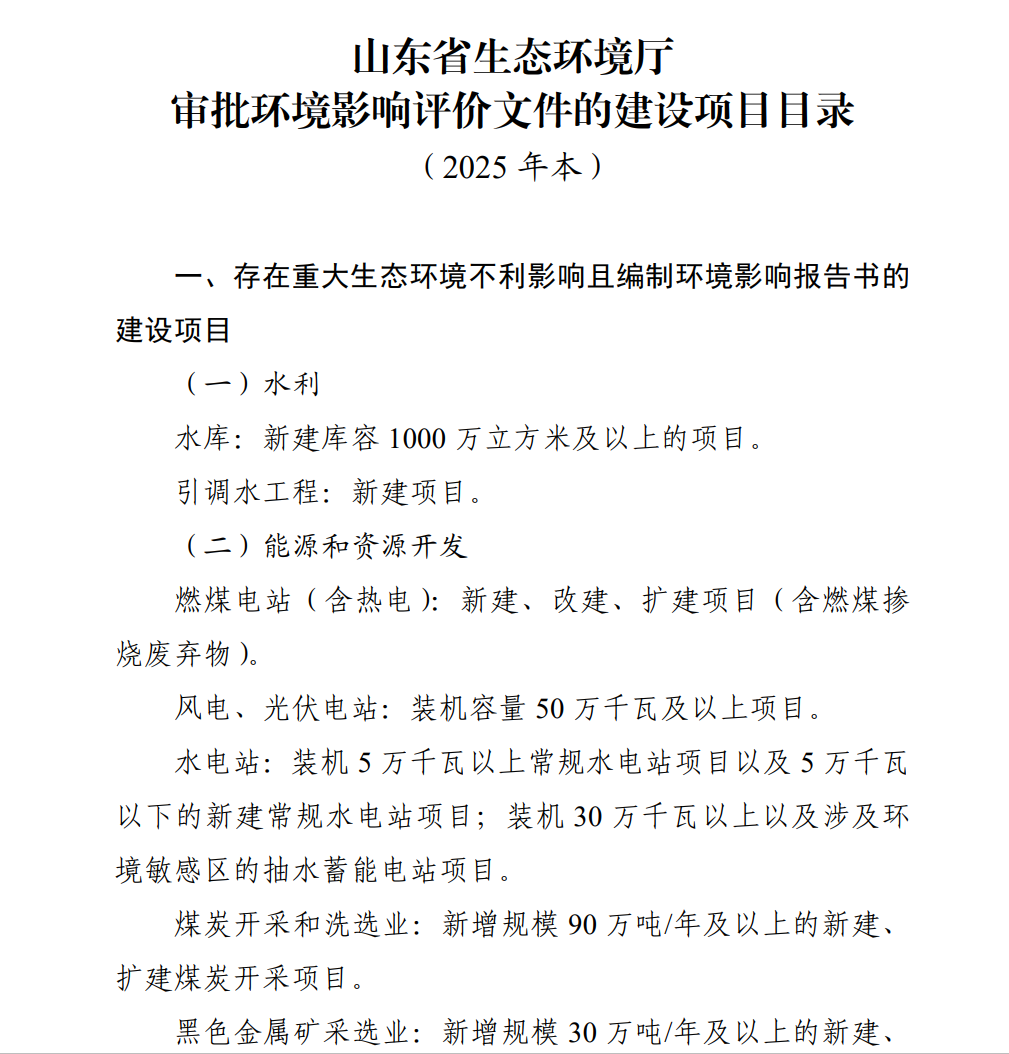 一、除生态环境部负责环评审批的建设项目外,列入《山东省生态环境厅审批环境影响评价文件的建设项目目录(2025年本)》建设项目的环境影响评价文件,由省生态环境厅负责审批。