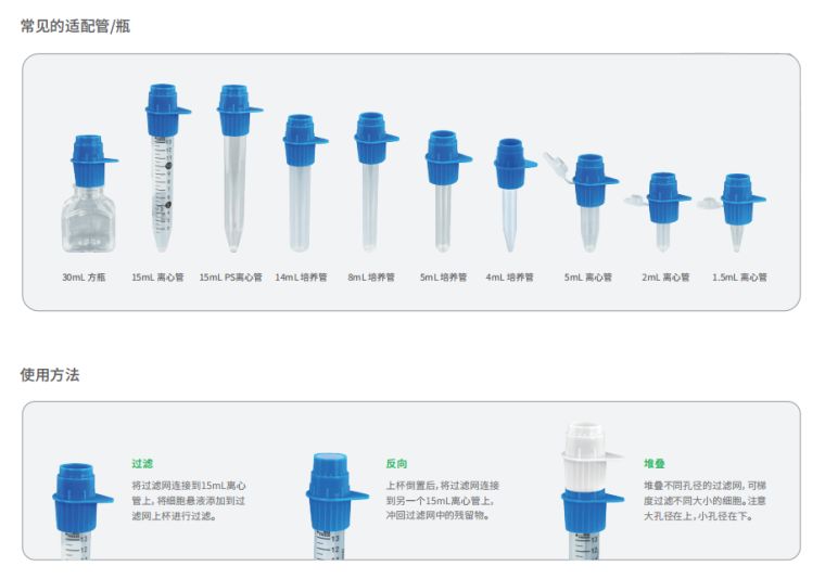 细胞过滤网是一种无菌筛分装置,可快速地从细胞簇和组织中分离和过滤原代细胞,有效地去除细胞悬液中的细胞聚集体或大颗粒,以保证后续流式细胞术、细胞分选等实验的准确性。