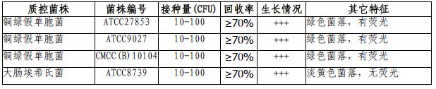 按标签用法制备培养基,接种以下质控菌株,放置35±2℃需氧培养18-72小时。