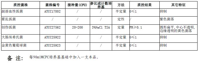 按标签用法制备培养基,接种以下质控菌株,放置36±1℃需氧培养18-24小时。