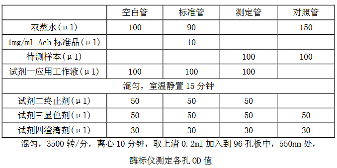 本试剂盒可测各种动物全血、红细胞、血清、血浆等样本中 Ach 含量.
