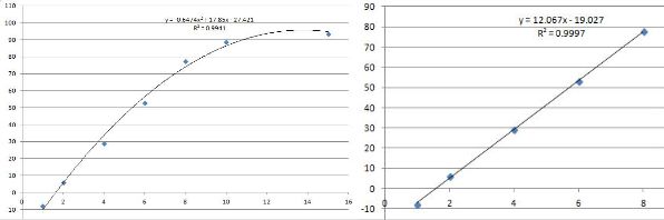 由上图可知:Vc标准工作液在 2~8μg/ml时线性关系良好, ·DPPH清除率与 Vc浓度呈正相关,当 Vc浓度大于 10即开始有偏差,Vc浓度大于 12时, ·DPPH清除率大于 90%。