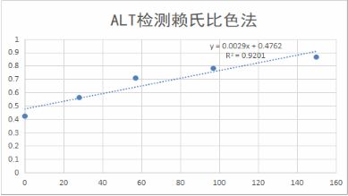 计算:以系列标准孔活力卡门单位为横坐标,以对应的吸光度为纵坐标,绘制标准曲线,以(A测定-A对照)之差值,从标准曲线查得 ALT活力卡门单位