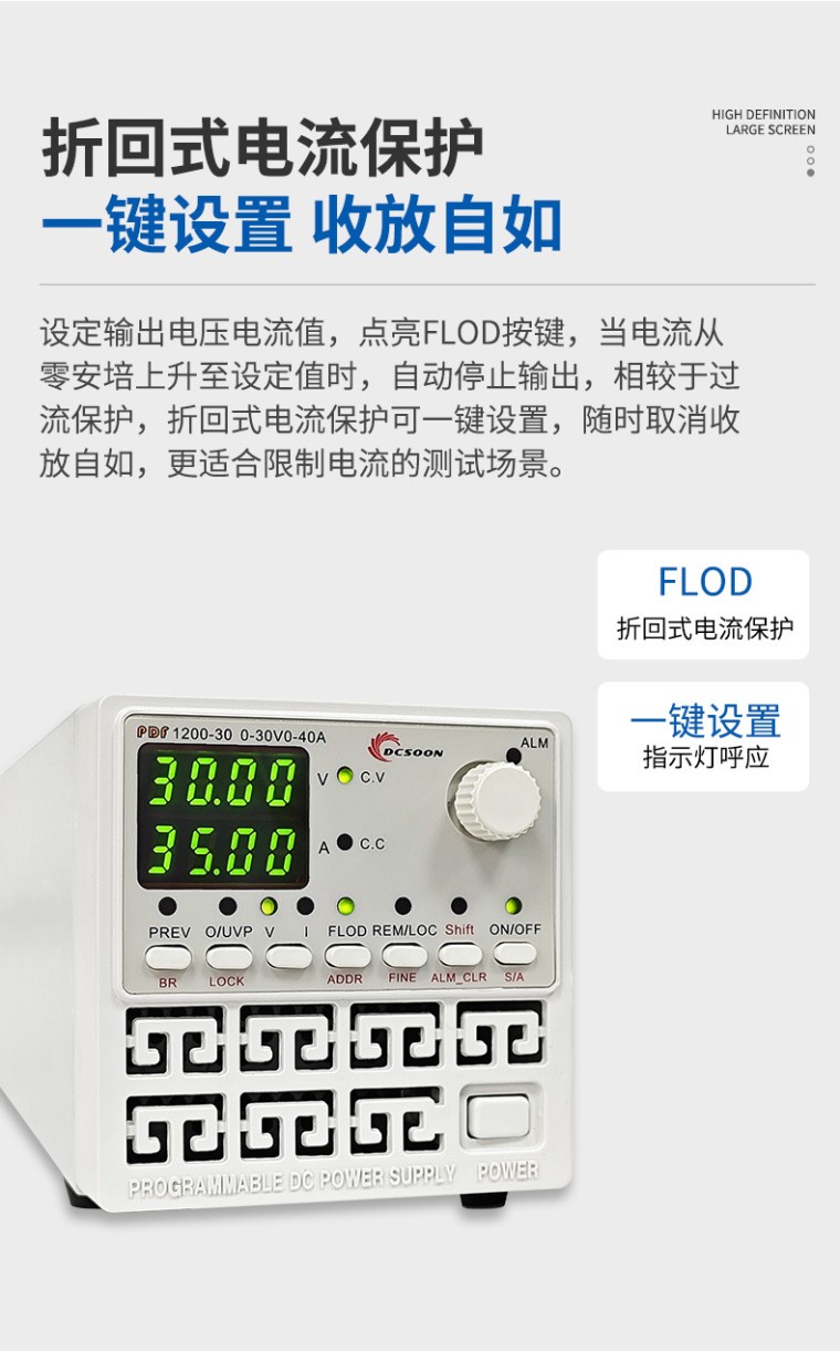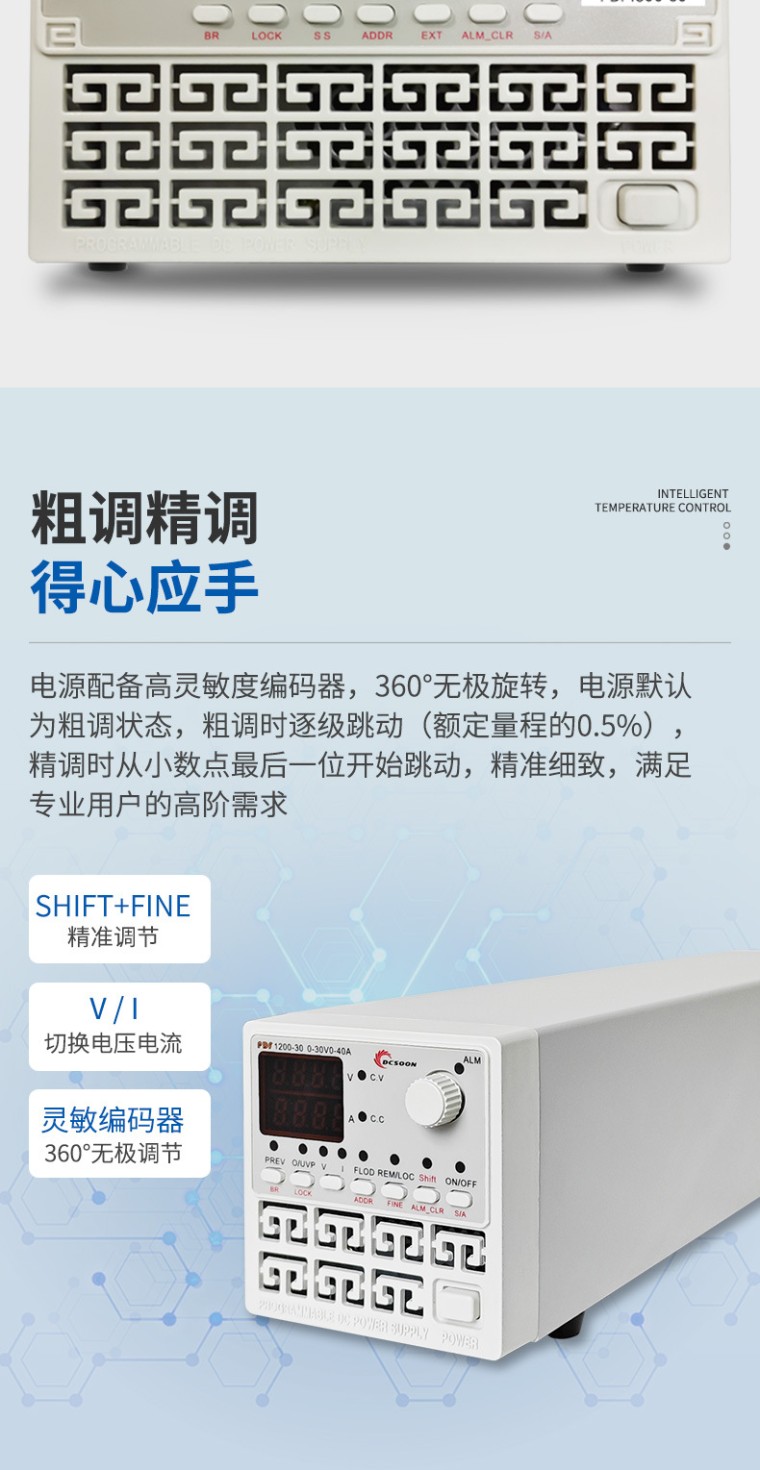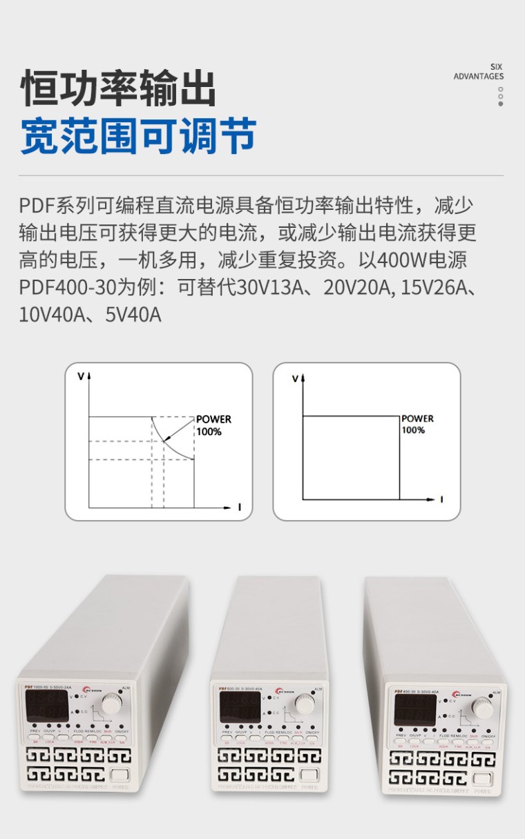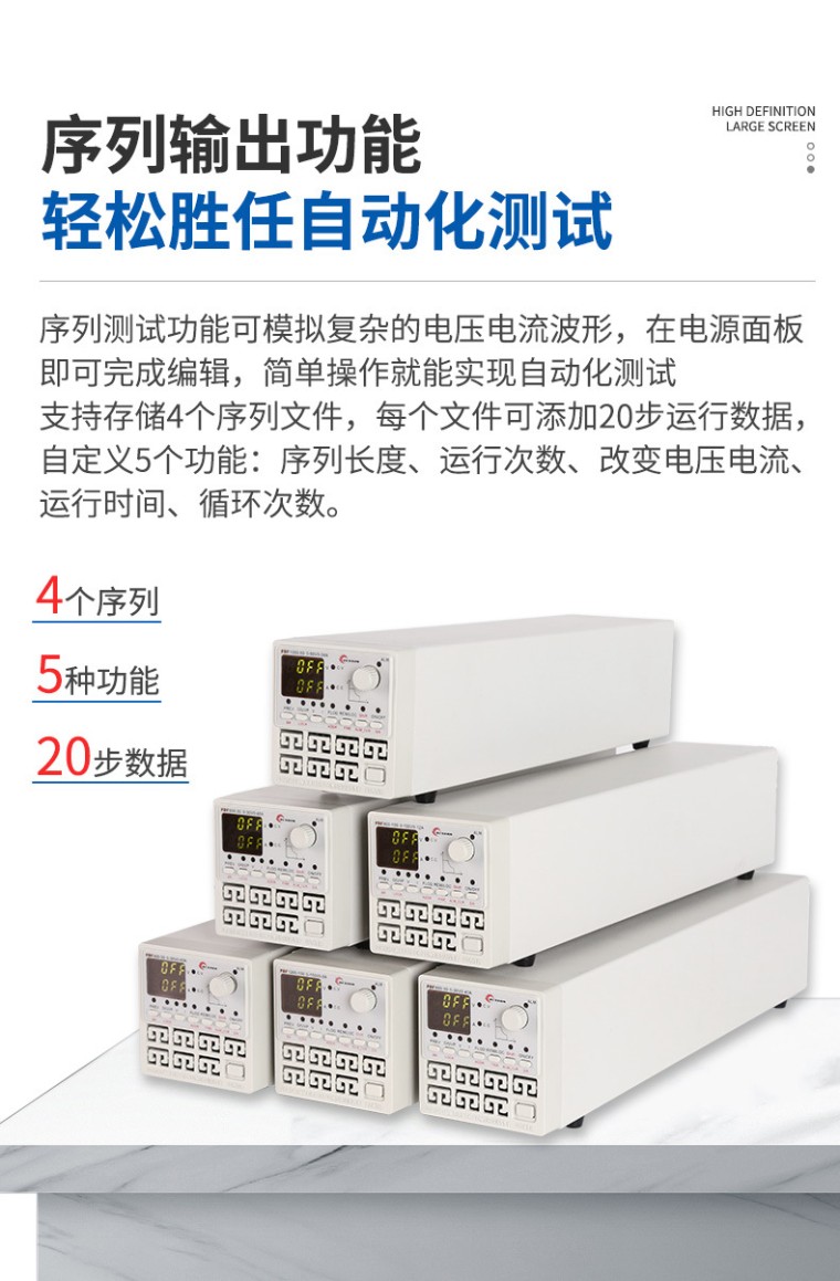 | 特色功能 | 恒压/恒流/恒功率、Shift组合功能键、序列输出功能、电压电流软启动0.1S-10S、专用并机接口、RS485通讯接口 |