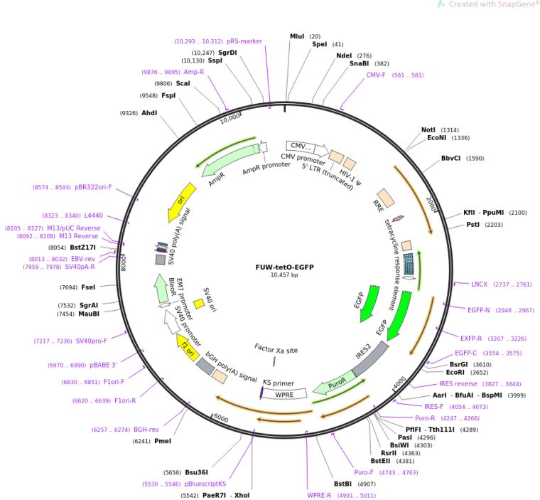 质粒备注:3rd generation lentiviral transfer plasmid. Expresses EGFP and puromycin resistance in mammalian cells under the control of a doxycycline-inducible promoter