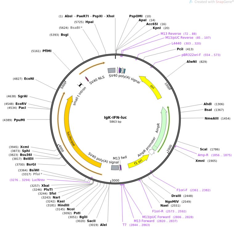 质粒备注:Reporter construct for NF‐κB activation. Contains two copies of immunoglobulin kappa light chain motif (5′‐GGGGACTTTCC‐3′) upstream of the a minimal promoter driving luciferase expression