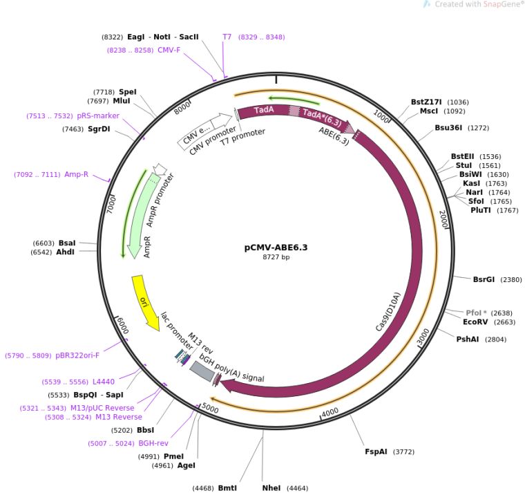 物种来源:Synthetic; TadA is from E.coli (synthetic gene block, mammalian codon optimized), Cas9 is S. pyogenes (mammalian codon optimized)