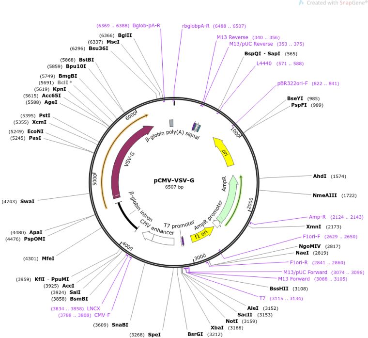 (Empty Backbone) Envelope protein for producing lentiviral and MuLV retroviral particles. Use in conjunction with a packaging vector such as pCMV-dR8.2 dvpr (lentiviral) or pUMVC (MuLV retroviral).