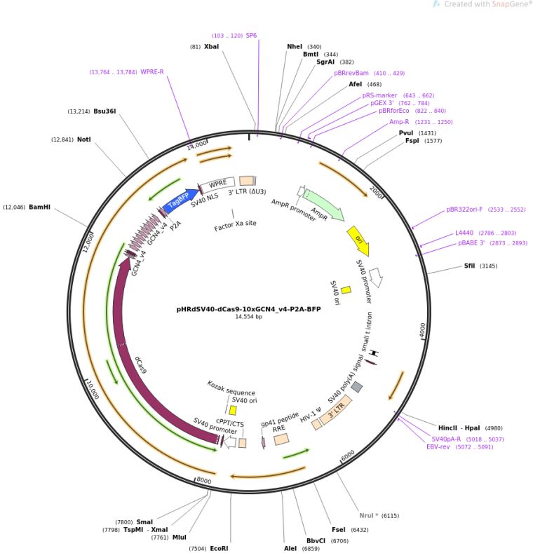 质粒名称:pHRdSV40-dCas9-10xGCN4_v4-P2A-BFP