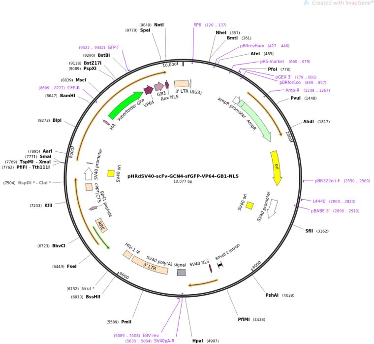 质粒名称:pHRdSV40-scFv-GCN4-sfGFP-VP64-GB1-NLS