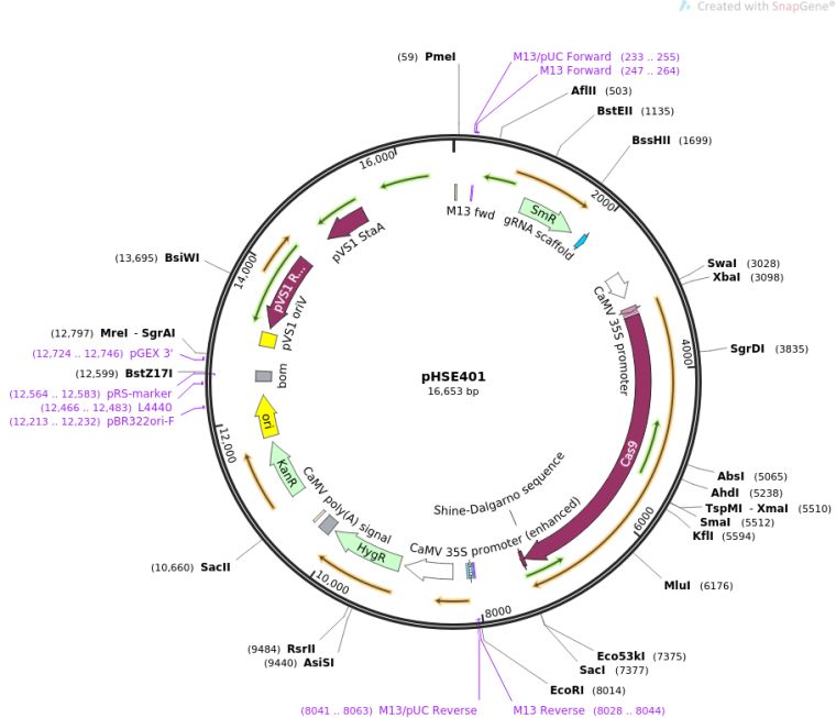 质粒备注:CRISPR/Cas based plant genome editing and gene regulation; expresses 3×FLAG-NLS-zCas9-NLS, gRNA scaffold for insertion of target sequence (AtU6-26 promoter), Hyg resistance