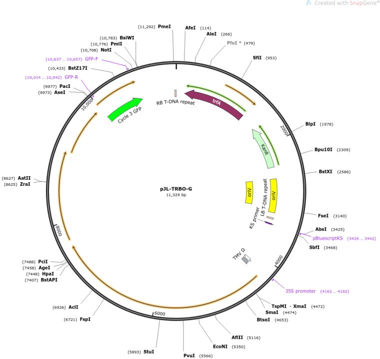 质粒备注:An improved agroinfection-compatible Tobacco mosaic virus (TMV)-based transient expression vector that lacks the TMV CP gene coding sequence and expresses GFP.