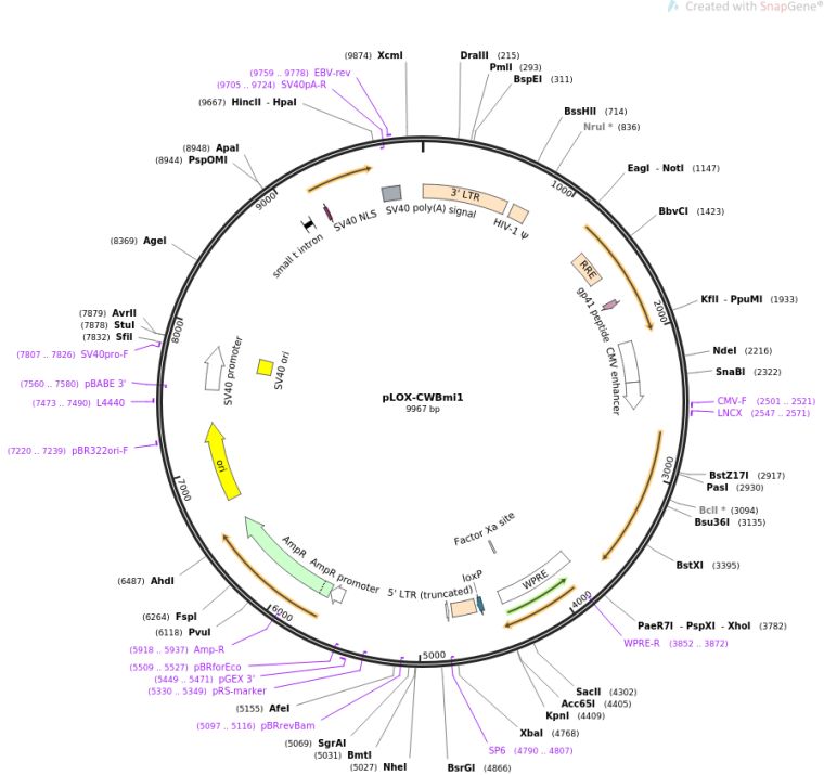 基因突变:CMV promoter upstream of mBmi-1. LoxP in 3' LTR.
