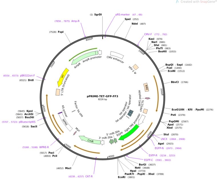质粒备注:3rd generation lentiviral transfer vector. pPRIME cloning plasmid with a tetracycline-responsive promoter (TET) controlling expression of GFP and miR30-based shRNA targeting firefly luciferase