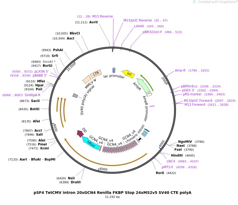 pSF4 TetCMV intron 20xGCN4 Renilla FKBP Stop 24xMS2v5 SV40 CTE polyA