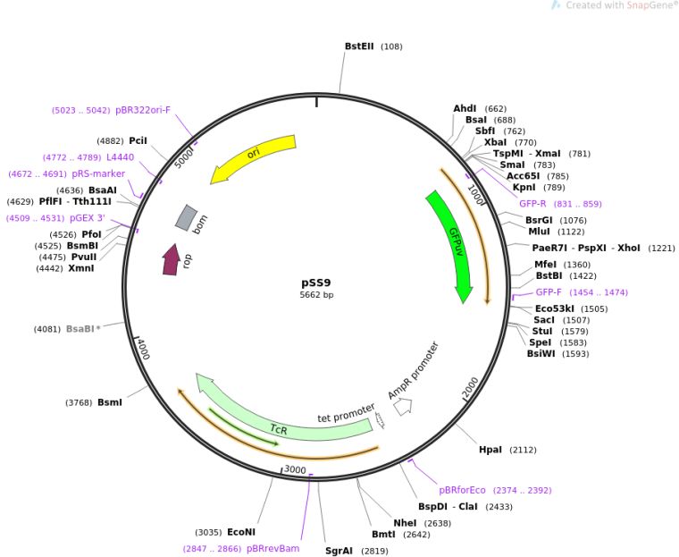 质粒备注:Contains 600 bp homology arms to SS9 for one-step markerless genome integration in E. coli