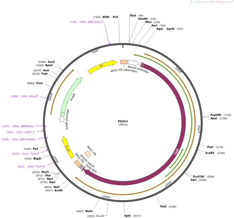 质粒备注:pAAV-pMecp2-SpCas9-spA (AAV-SpCas9). AAV plasmid expressing Cas9 in neurons under control of truncated mecp2 promoter.