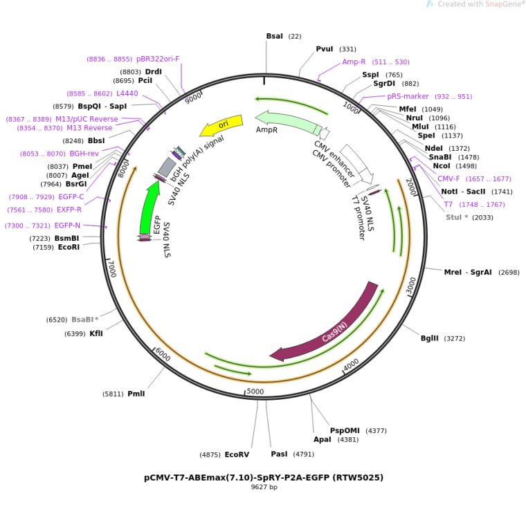 质粒名称:pCMV-T7-ABEmax(7.10)-SpRY-P2A-EGFP (RTW5025)