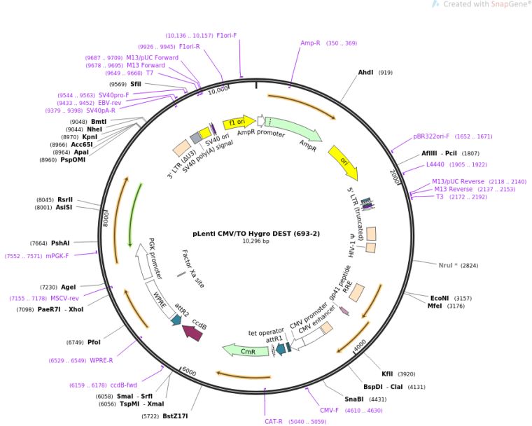 质粒备注:(Empty Backbone) 3rd gen lentiviral Gateway destination vector, expression, CMV/TO promoter, Hygro