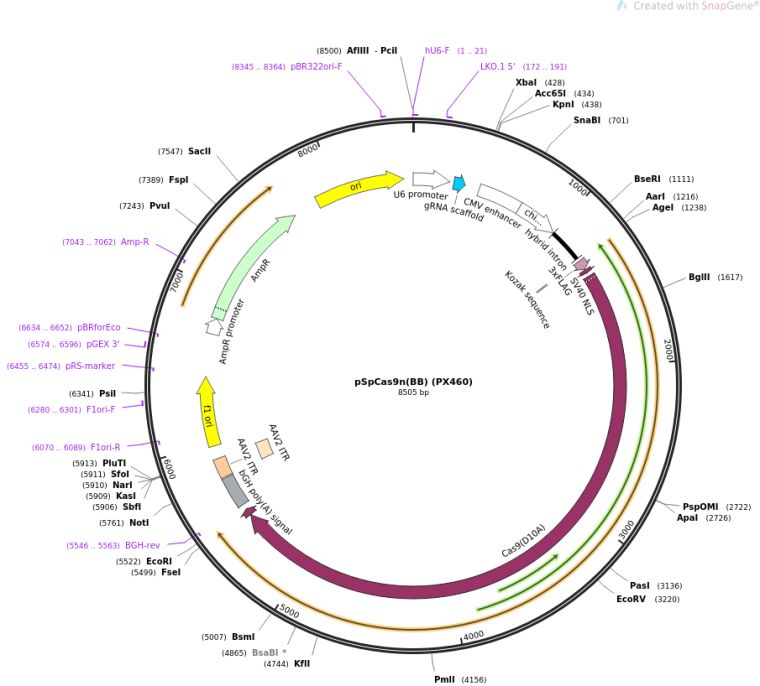 质粒名称:pSpCas9n(BB) (PX460)