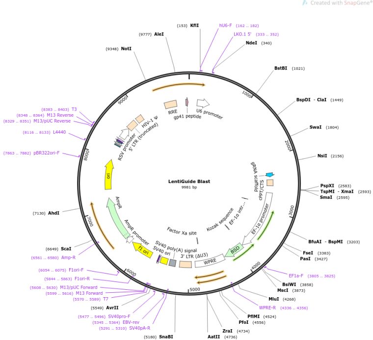 质粒备注:(Empty Backbone) Expresses S. pyogenes CRISPR chimeric RNA element with customizable sgRNA from U6 promoter and blasticidin resistance from EF-1a promoter.