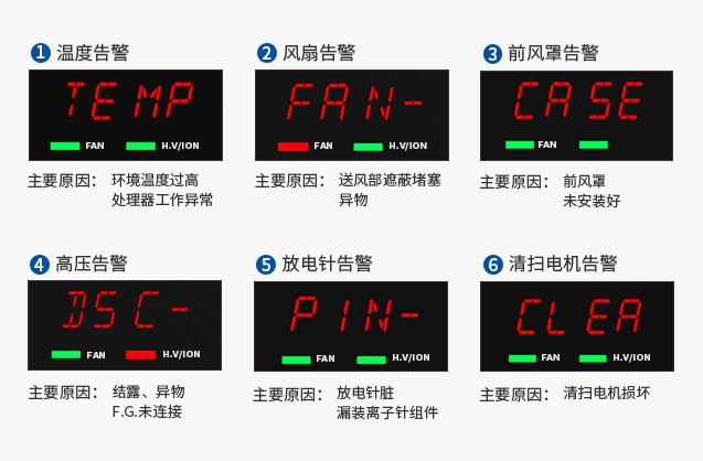 采用高清LED显示屏,通过警示直观显示6种报警状态: 温度异常(TEMP) 风扇故障(FAN -) 高压报警(DSC-) 放电针告警(PIN-) 清洁提醒(CLEA) 前网罩告警(CASE) 支持PLC与RS485远程控制,适配半导体封装、SMT产线等场景. |