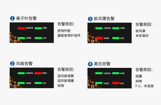 4种报警功能直观显示 采用多色LED屏显技术,实时直观显示四种报警状态:高压异常、风扇故障、离子针脏物、前网罩未接好。支持PLC通讯,可远程监控设备运行参数,适配半导体封装、SMT产线等高精度场景。 |
