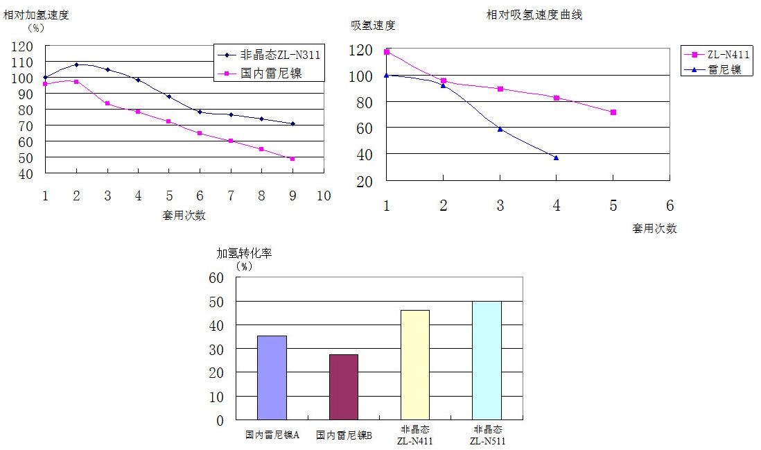 ZL-N211非晶态合金催化剂相对于其它非晶态催化剂,活性略低,常用于容易进行氢化或选择性加氢的反应,在环丁烯砜加氢制备环丁烷砜,对硝基苯酚加氢制备对氨基苯酚,芳香环加氢制备环烷烃,醛、酮加氢制备醇,芳胺、双氧水的的制备领域有着广泛的应用。