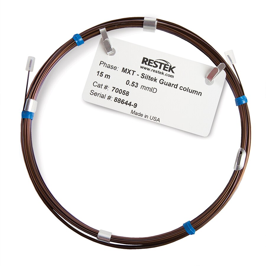 Guard columns and retention gaps are widely used in gas chromatography for different reasons. A guard column traps nonvolatile material at the head of the column, not allowing it to reach the analytical column, protecting it. A retention gap helps focus the compounds transferred from the inlet as a small band at the head of the analytical column to minimize chromatographic peak broadening. Siltek-treated, stainless-steel MXT guard columns provide excellent compatibility with MXT analytical columns while offering the strength of metal with the inertness of glass. These guard columns can also function as retention gaps. To discover how to connect an MXT guard column or retention gap (deactivated tubing) to an analytical column using an MXT low dead-volume connector, see the MXT Low Dead Volume Connectors for Use with Fused Silica Capillary Columns installation instructions.