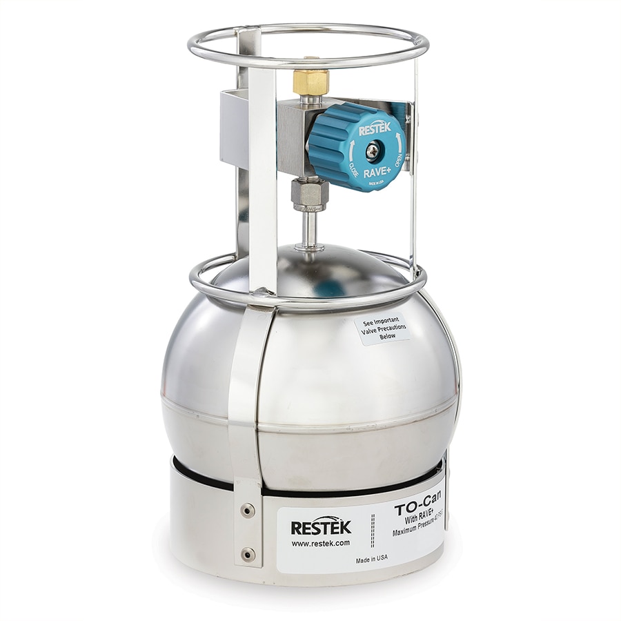 U.S. EPA Methods TO-14A and TO-15A regulate the collection, storage, and analysis of volatile organic compounds (VOCs) using treated air sampling canisters. Restek offers a complete line of TO-Can canisters (SUMMA can equivalent) electropolished using a proprietary process and extensively cleaned using an ultrasonic method. This ensures a high-quality, passivated surface that maintains the stability of TO-14A/TO-15/TO-15A compounds during storage. A frame surrounds the electropolished canister, eliminating the need for weld marks on the sphere, thereby preventing active sites on the canister. The high-performance valve supports the excellent quality of the canister.