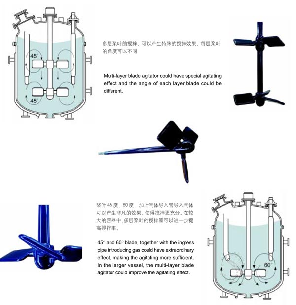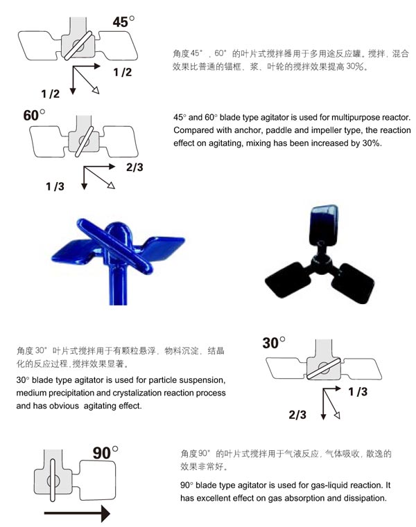 太极叶片式搪玻璃搅拌器:角度45°、60°的叶片式搪玻璃搅拌器用于多用途反应罐。搅拌,混合效果比普通的锚式、框式、桨叶式、叶轮式搅拌效果提高30%。角度30°叶片式搅拌用于有颗粒悬浮物,物料沉淀,结晶化的反应过程,搅拌效果显著。角度90°的叶片式搅拌用于气液反应,气体吸收,散逸的效果非常好。多层桨叶的搅拌器,可以产生特殊的搅拌效果,每层桨叶的角度可以不同。桨叶45读、60度,加上气体导入管导入气体可以产生非凡的效果,使得搅拌更充分。在较大的容器中,多层桨叶的搅拌器可以进一步提高搅拌率。