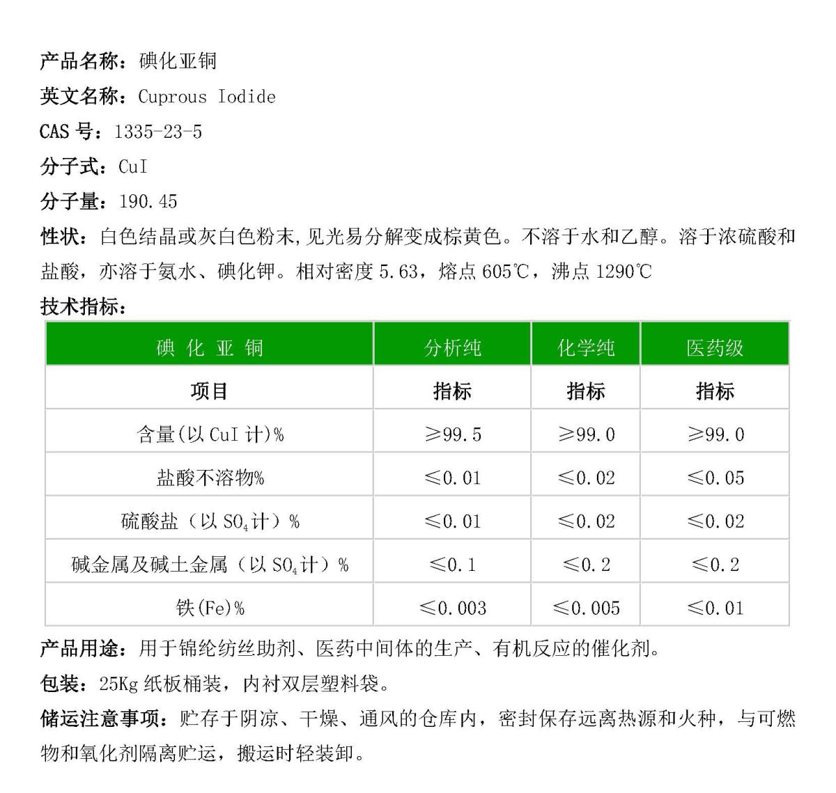 性状:白色结晶或灰白色粉末,见光易分解变成棕黄色。不溶于水和乙醇。溶于浓硫酸和盐酸,亦溶于氨水、碘化钾。相对密度5.63,熔点605℃,沸点1290℃产品用途:用于锦纶纺丝助剂、医药中间体的生产、有机反应的催化剂。