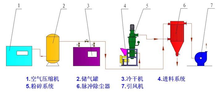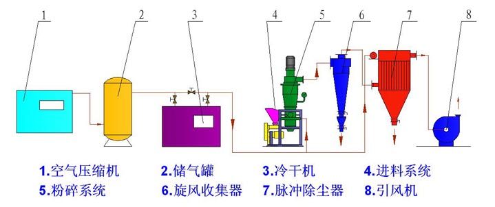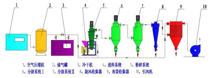 压缩空气经过冷冻、过滤、干燥后,经喷嘴形成超音速气流射入粉碎室,使物料呈流态化,被加速的物料在数个喷嘴的喷射气流交汇点汇合,产生剧烈的碰撞、磨擦、剪切而达到颗粒的超细粉碎。粉碎后的物料被上升的气流输送至叶轮分级区内,在分级轮离心力和风机抽力的作用下,实现粗细粉的分离,粗粉根据自身的重力返回粉碎室继续粉碎,合格的细粉随气流进入旋风收集器,微细粉尘由袋式除尘器收集,净化的气体由引风机排出。