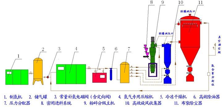 6、对易燃、易爆的物料可用惰性气体作介质实现全封闭粉碎,惰性气体循环使用,损耗极低。