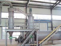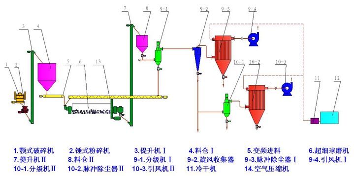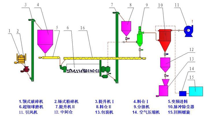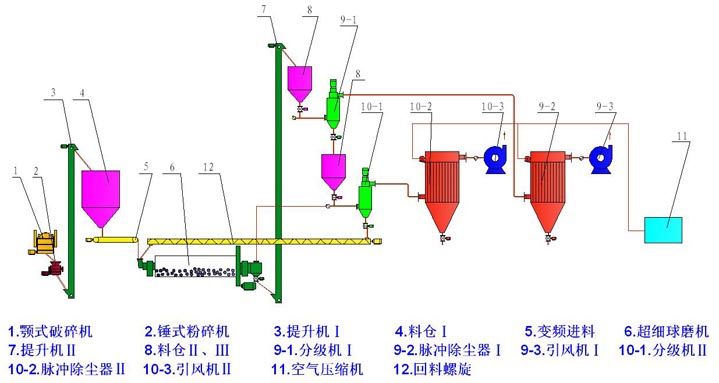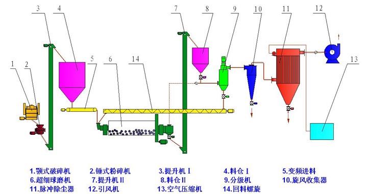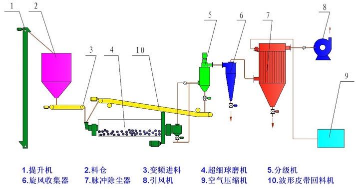物料经粗破后,由提升输送设备进入超细球磨机,磨机内的研磨介质凭借磨机旋转时所获得的能量对物料进行冲击粉碎和研磨粉碎,粉碎后的物料经卸料仓进入自分流式微粉分级机进行分级,实现粗细粉的分离,合格的细粉由收集器收集,粗颗粒由分级机下端重新进入球磨机进行粉碎,净化气体由引风机排出。