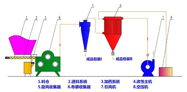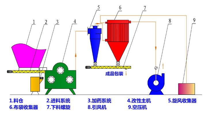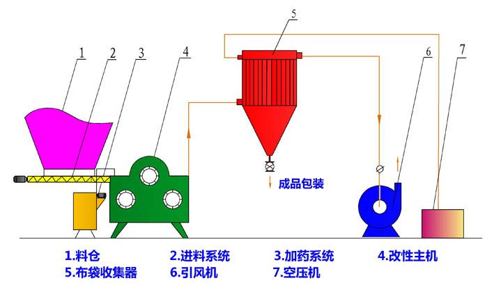 物料由进料系统进入改性机内,改性药剂由计量泵加入。物料和药剂在改性机内受到若干次高速混合,同时利用设备与物料高速运动产生的热量完成药剂对粉体的表面包覆改性,成品由后端的负压收集系统收集。