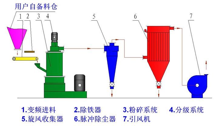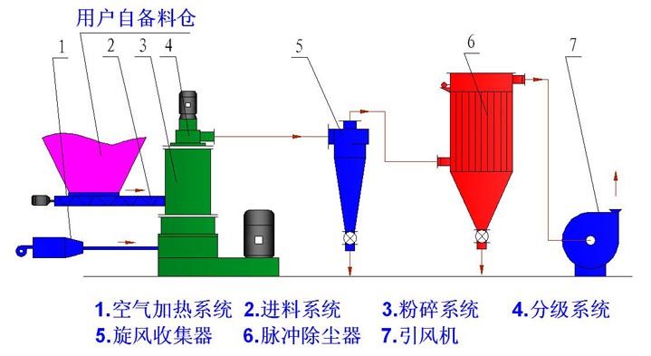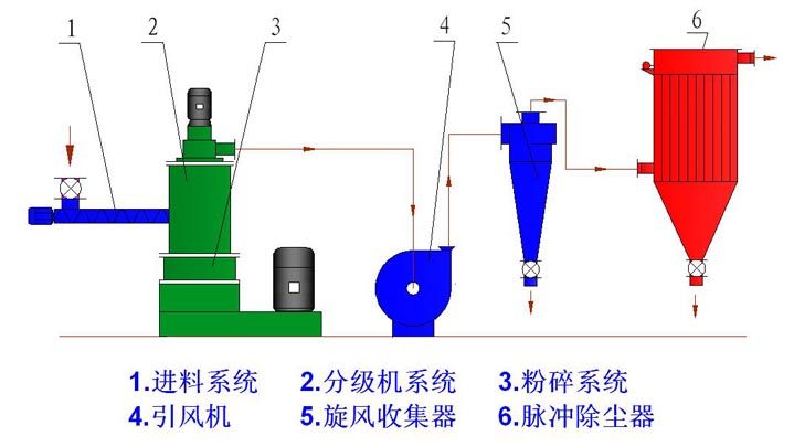 物料由进料装置输送至主机粉碎腔,物料与高速回转器件及颗粒之间互相冲击、碰撞、磨擦、剪切、挤压而实现粉碎。粉碎后的物料通过分级轮实现粗细粉的分离,粗粉流入粉碎腔再次粉磨,净化的气体由引风机排出。