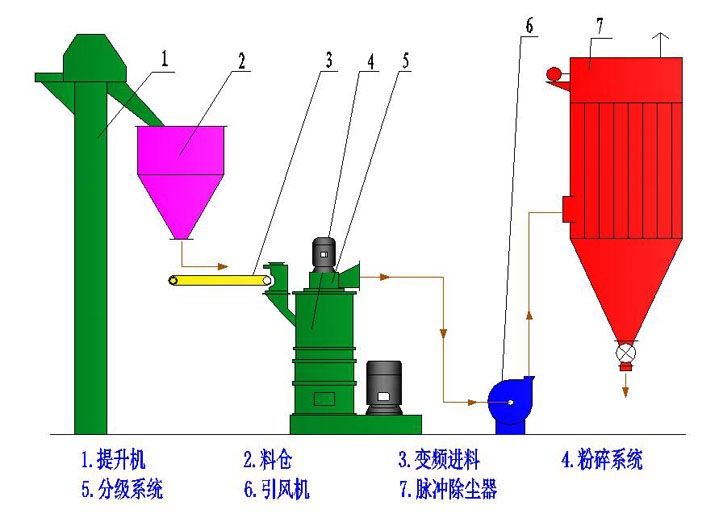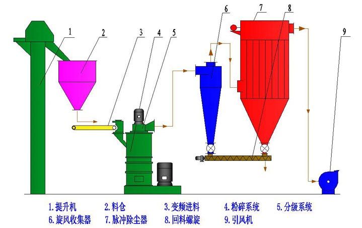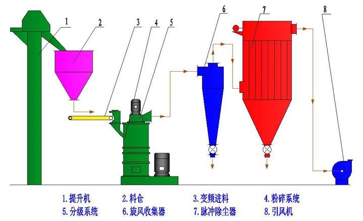 物料经变频给料机送入粉碎腔内,经磨辊挤压、剪切、研磨实现物料的超细粉碎。粉碎后的物料被上升的气流输送至分级区,在分级轮离心力和风机抽力的作用下,实现粗细粉的分离,达到细度的产品由收集器收集,粗颗粒返回粉碎腔再次粉磨,净化的空气由引风机排出。