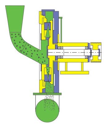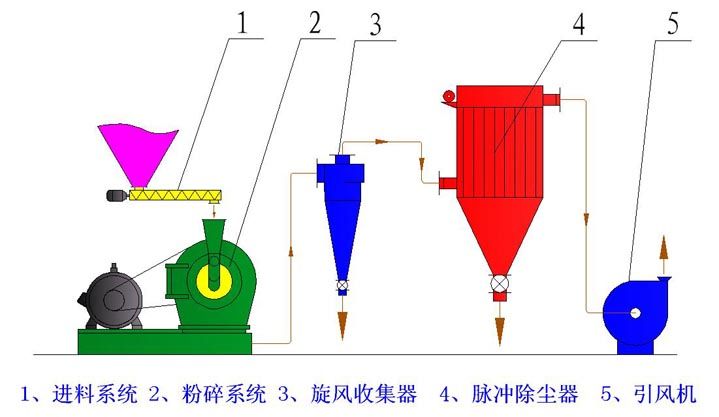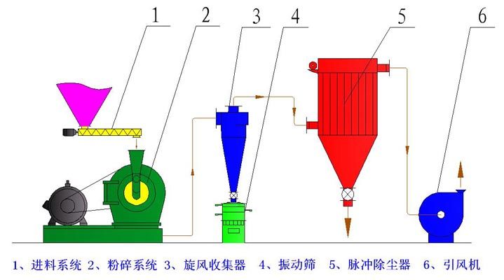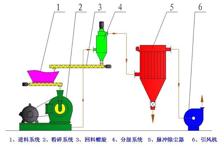 原料通过给料机送入磨内,经高速运转的转子盘与定子盘产生强大的剪切力而粉碎。粉碎后的细粉被系统气流送至收集系统收集。