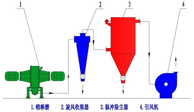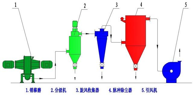 物料由上端进料装置进入主机粉碎腔,粉碎腔内装有两个动盘,动盘上装有分布均匀的销棒。两个动盘相反方向高速运转,最高相对速度可达250m/s。物料以极高速度撞击动盘销棒,空气紊流作用也会使颗粒之间高速碰撞。产品的细度通过调节动盘转速来实现。