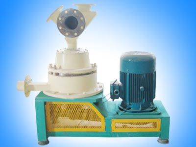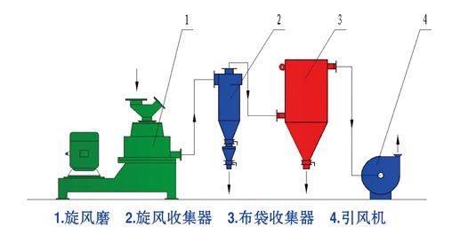 物料经变频给料机自旋风磨顶部加入装配有刀片转子的粉碎腔,旋转的刀片转子在粉碎腔内产生超高速的空气旋流,物料在空气旋流作用下进入到转子与定子的间隙内迫使颗粒之间的冲击、剪切、摩擦,造成颗粒在高应力下的裂解细化,从而实现物料粉碎。粉碎腔内部结构经科学设计,腔内的空气旋流运动导向明确,无流动死角,也保证了粉碎过程中无温升。物料粉碎细度可通过不拆机调整定子与转子之间的间隙来控制。粉碎后的物料可经负压输送装置进入收集器收集,也可经外配分级机进行精细分选、粗粒续磨作业。