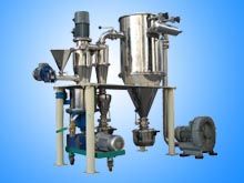 压缩空气经过冷却、过滤、干燥后,经喷嘴形成超音速气流射入旋转粉碎室,使物料呈流态化,在旋转粉碎室内,被加速的物料在数个喷嘴的喷射气流交汇点汇合,产生剧烈的碰撞、磨擦、剪切而达到颗粒的超细粉碎。粉碎后的物料被上升的气流输送至叶轮分级区内,在分级轮离心力和风机抽力的作用下,实现粗细粉的分离,粗粉根据自身的重力返回粉碎室继续粉碎,合格的细粉随气流进入旋风收集器,微细粉尘由袋式除尘器收集,净化的气体由引风机排出。