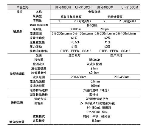 ①. UF-9100的溶剂输送系统压力范围是0-3000psi,无论是填料粒径为5um的高压制备柱,还是粒径稍大的低压制备柱,均能满足需要。