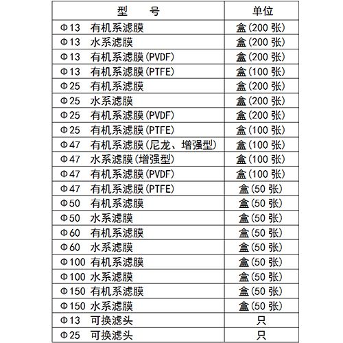 AF系列微孔过滤膜有混合纤维树脂及偏氟乙烯树脂、纤维素、尼龙,聚偏氟乙烯(PVDF)、聚四氟乙烯(PTFE)、醋酸脂等各种规格,直径分别为¢50mm、¢25mm、¢13mm等。过滤孔径有0.22、0.45、0.8、1.2um等多种选择。