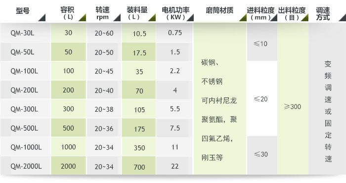 1. 型号说明:QM-(体积)-(A调速型,B普通型) 如:QM-50-A 为50L调速型辊筒球磨机;