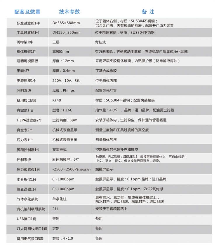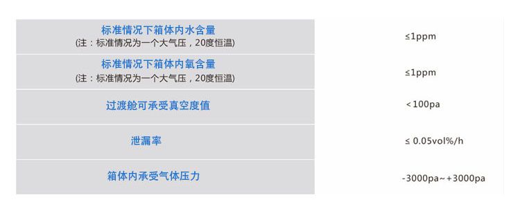 标准情况下箱体内氧含量:≤1ppm (注:标准情况为一个大气压,20度恒温)