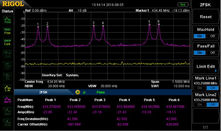 ![]() | 通过快速捕获功能完成ASK/FSK信号抓取 汽车遥控钥匙,TPMS胎压模块及小无线模块等通常使用ASK/FSK调制。DSA700可通过SSC-DSA功能扩展来完成ASK/FSK信号的抓取,并且内置2FSK测试功能,可直接获取其中心频率、功率及偏移等参数。 |