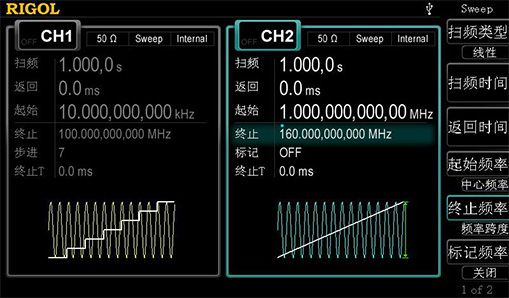 | 多种扫频模式 支持由低频向高频或由高频向低频扫描输出,扫描类型包括线性、对数和步进,可设定“标记”频率,满足更多幅频测试应用需求。 |