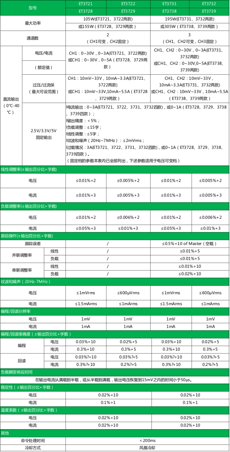 ● 独立可调输出:1路(ET372X)/2路(ET373X)可调输出30V/3A(30V/5A),1路2.5V/3.3V/5V档位可调固定输出;大输出总功率可达305W;