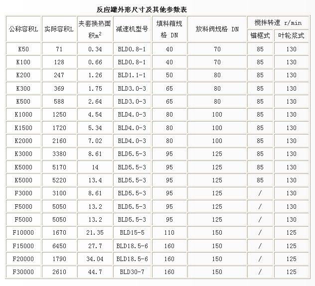 该设备从结构上分为开式(代表符号K)和闭式(代表符号F),从规格上分为实验室用5L-40L和生产用50L-30000L。搪玻璃层厚度0.8-2.0mm并经20KV高电压检测,工作温度:-20℃—200℃,工作压力:罐内≤10kgs,夹套内≤6kgs.整套设备包括:罐体、罐盖(闭式为一体,开式由垫片和卡子连接)、电机(防爆、普通、变频)、减速机(摆线针轮、螺旋锥齿轮)、密封(填料、单机封、双机封)、搅拌(锚式、叶轮式、桨式、组合式)、温套管(直型、斜型、带翼)、放料阀(上展、下展),其它如液位计等可根据要求配置。通过夹套给罐内物料加热的方式有蒸气加热、油加热、电加热等。支撑方式分为托耳(放在工作架上)和支腿(放在地上)两种。